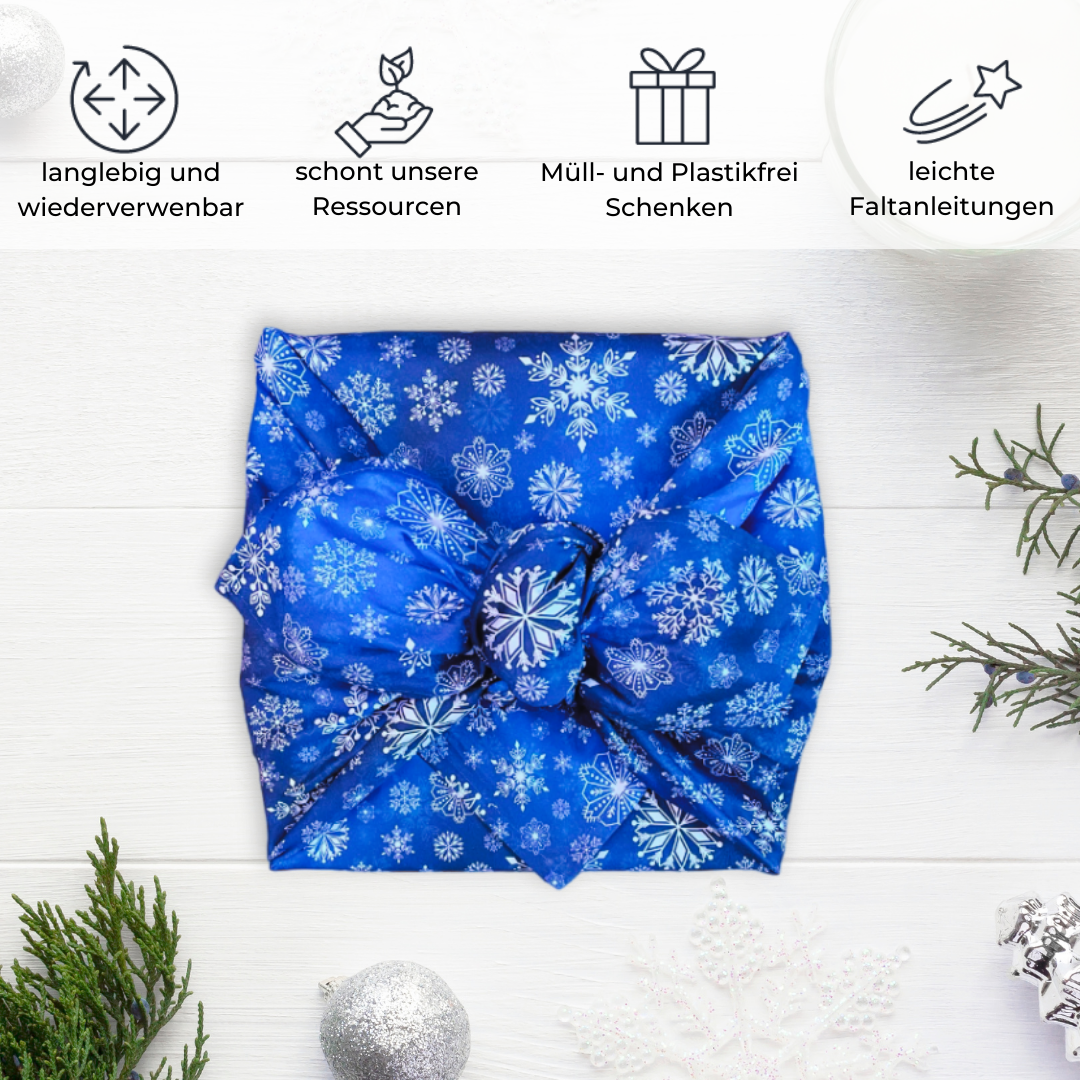 Unser shickii Frostia - weiße Schneeflocken auf dunkelblauen Hintergrund ist der Klassiker an Weihnachten. Wie wäre es mit nachhaltig verpackten Geschenken unterm Weihnachtsbaum - ein wahrer Hingucker!