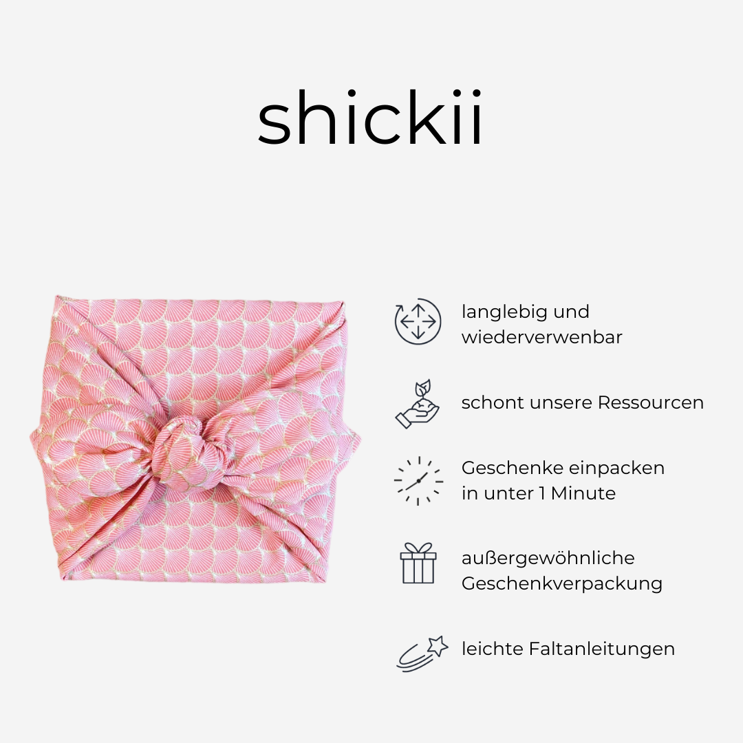 Wie wär es, wenn dein liebevoll verpacktes Geschenk nicht einfach lieblos aufgerissen wird und das Geschenkpapier sinnlos im Müll landet? Unsere shickii´s werden immer wiederverwendet. Das spart nicht nur viel Müll. Du musst auch nicht immer wieder neues Geschenkpapier kaufen. Geschenke Einpacken mit unseren Faltanleitungen in weniger als 1 Minute und kinderleicht.