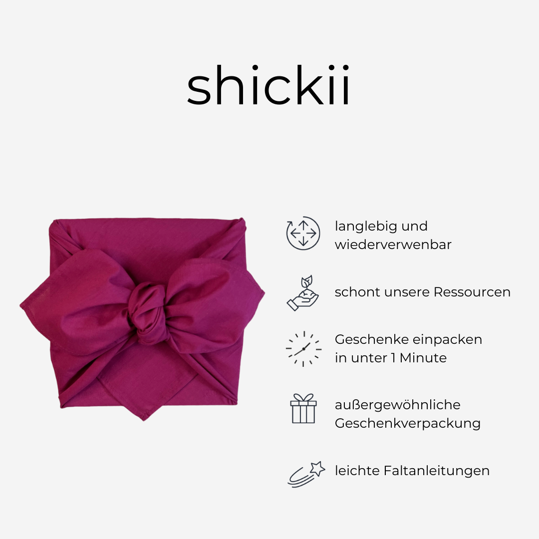 Wie wär es, wenn dein liebevoll verpacktes Geschenk nicht einfach lieblos aufgerissen wird und das Geschenkpapier sinnlos im Müll landet? Unsere shickii´s werden immer wiederverwendet. Das spart nicht nur viel Müll. Du musst auch nicht immer wieder neues Geschenkpapier kaufen. Geschenke Einpacken mit unseren Faltanleitungen in weniger als 1 Minute und kinderleicht.